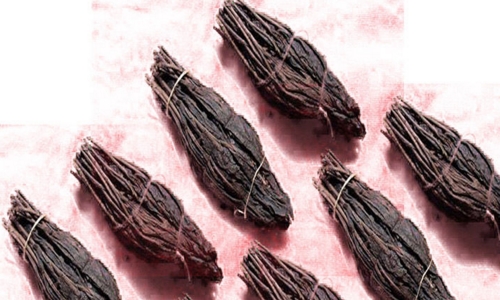 龍須茶具有工藝晶的性質,它對外形的要求極高,茶束的外觀形狀,必須滿像蘸墨汁而直立的短毛筆,色呈墨綠,長約二寸八分,最大處周圓約二寸半,不宜過大或過小,四十至五十個干茶束約重一斤。茶束分單束和雙束兩種,均扎以鮮艷的紅、綠絲線。