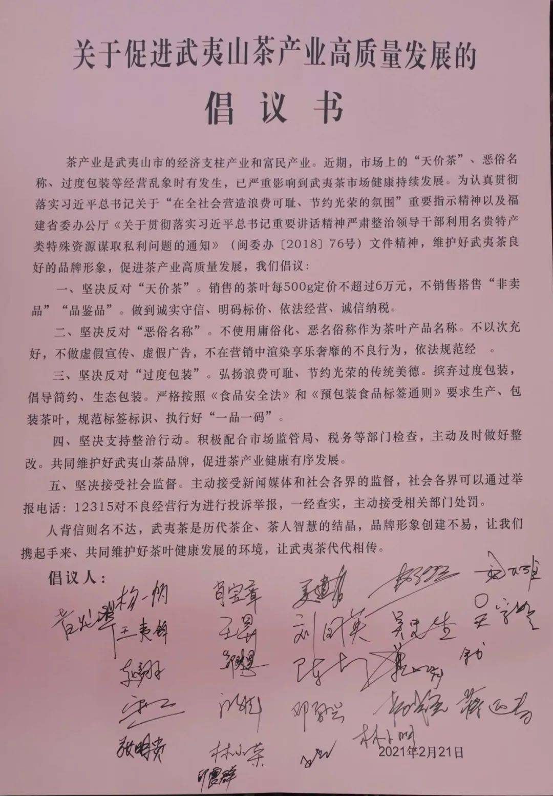 2月21日下午,武夷山市召開促進(jìn)茶葉市場健康發(fā)展推進(jìn)會(huì),26家曾出現(xiàn)在網(wǎng)傳“天價(jià)茶”榜單上的武夷山茶企負(fù)責(zé)人共同簽署《關(guān)于促進(jìn)武夷山茶產(chǎn)業(yè)高質(zhì)量發(fā)展的倡議書》,堅(jiān)決反對“天價(jià)茶”,堅(jiān)決反對“惡俗名稱”、“過度包裝”,承諾不做虛假宣傳,規(guī)范經(jīng)營管理,不銷售“非賣品”“品鑒品”,自覺接受監(jiān)督,如有違法違規(guī)行為,一經(jīng)查實(shí),主動(dòng)接受相關(guān)部門處罰。