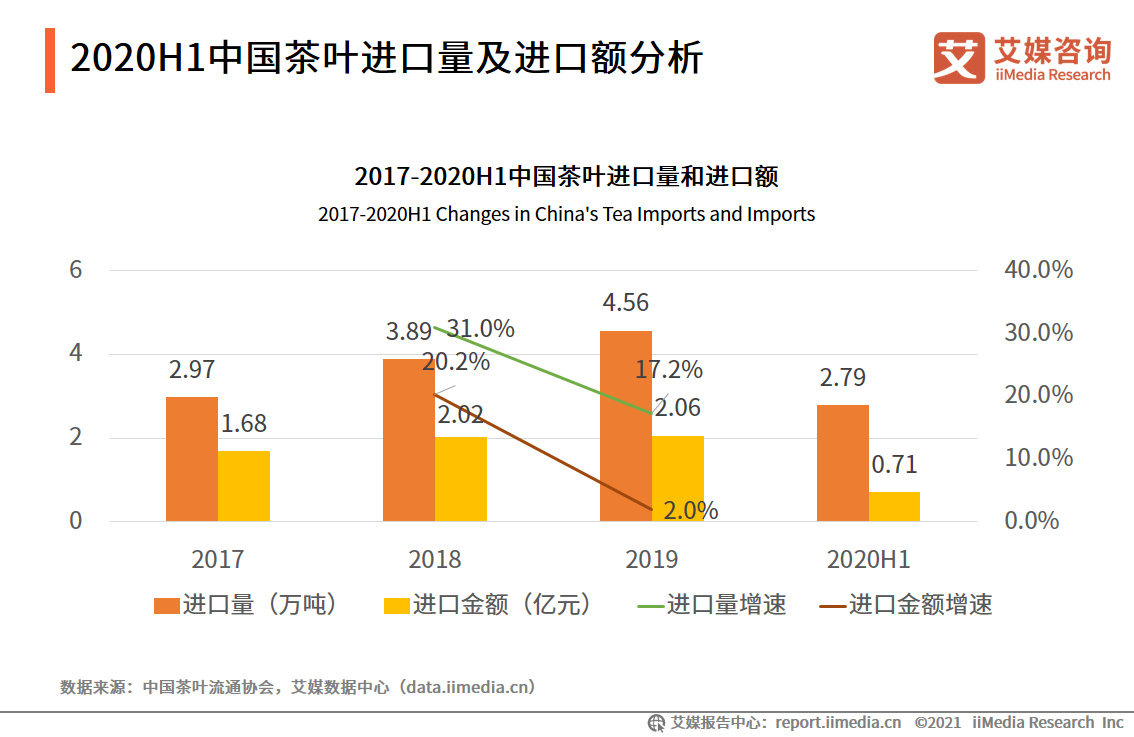 從進口情況來看,2019年,中國茶葉進口數(shù)量較上一年增長17.2%至4.56萬噸;茶葉進口金額較一年增加2.0%至2.06億元。2020年上半年,中國茶葉進口量和進口金額分別為2.79萬噸和0.71億元。