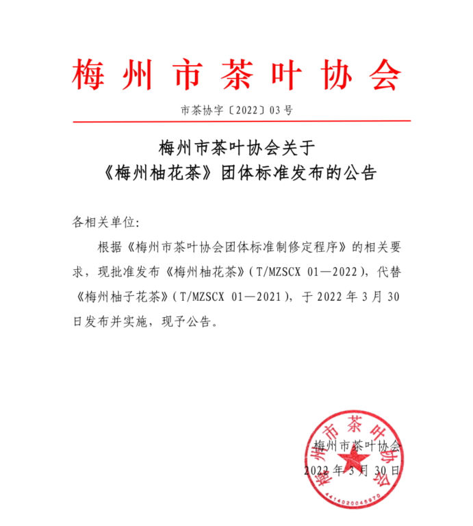 梅州市茶葉協(xié)會關于 《梅州柚花茶》團體標準發(fā)布的公告