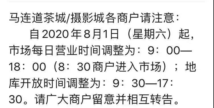 7月29日,北京市馬連道茶城管委會(huì)向所轄茶城下發(fā)通知:8月1日起,馬連道茶城每日營(yíng)業(yè)時(shí)間將調(diào)整為9:00-18:00,地庫(kù)開(kāi)放時(shí)間調(diào)整為9:30-17:30。至此,馬連道茶葉一條街終于全面恢復(fù)正常營(yíng)業(yè)。