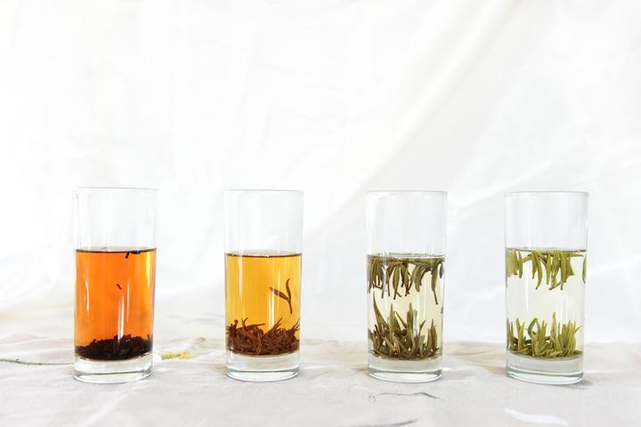 從左到右,依次為武義產(chǎn)黑茶、紅茶、白茶、綠茶。